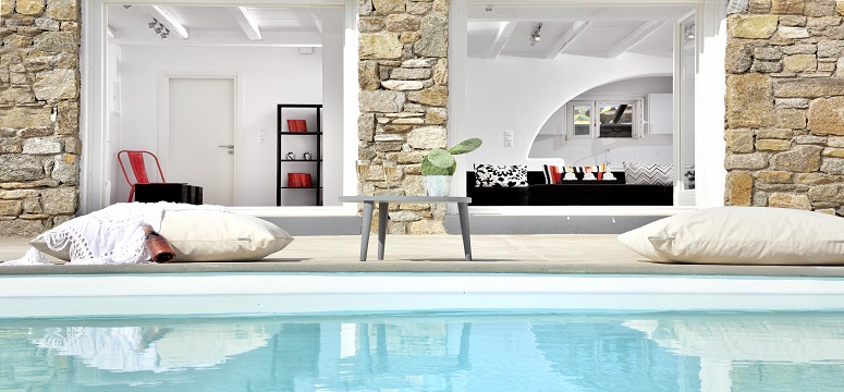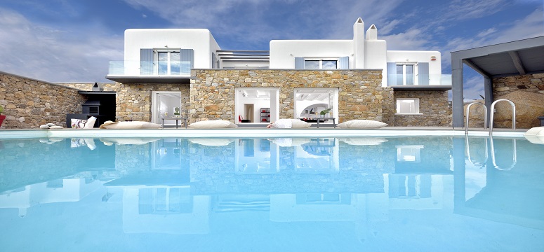 With panoramic view of Mykonos town, the old and new port and the island of Tinos, villa Sunlight III offers comfortable accommodation for 10 persons and has 5 bedrooms, 5 bathrooms, fireplace, flat screen TV with dvd player, sound bar, PlayStation, internet connection and alarm system.